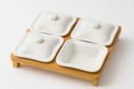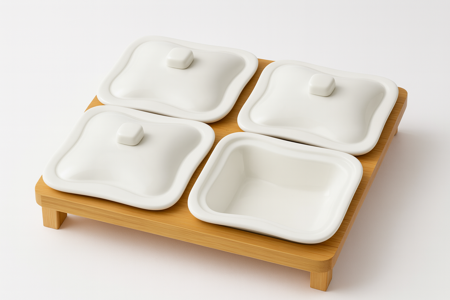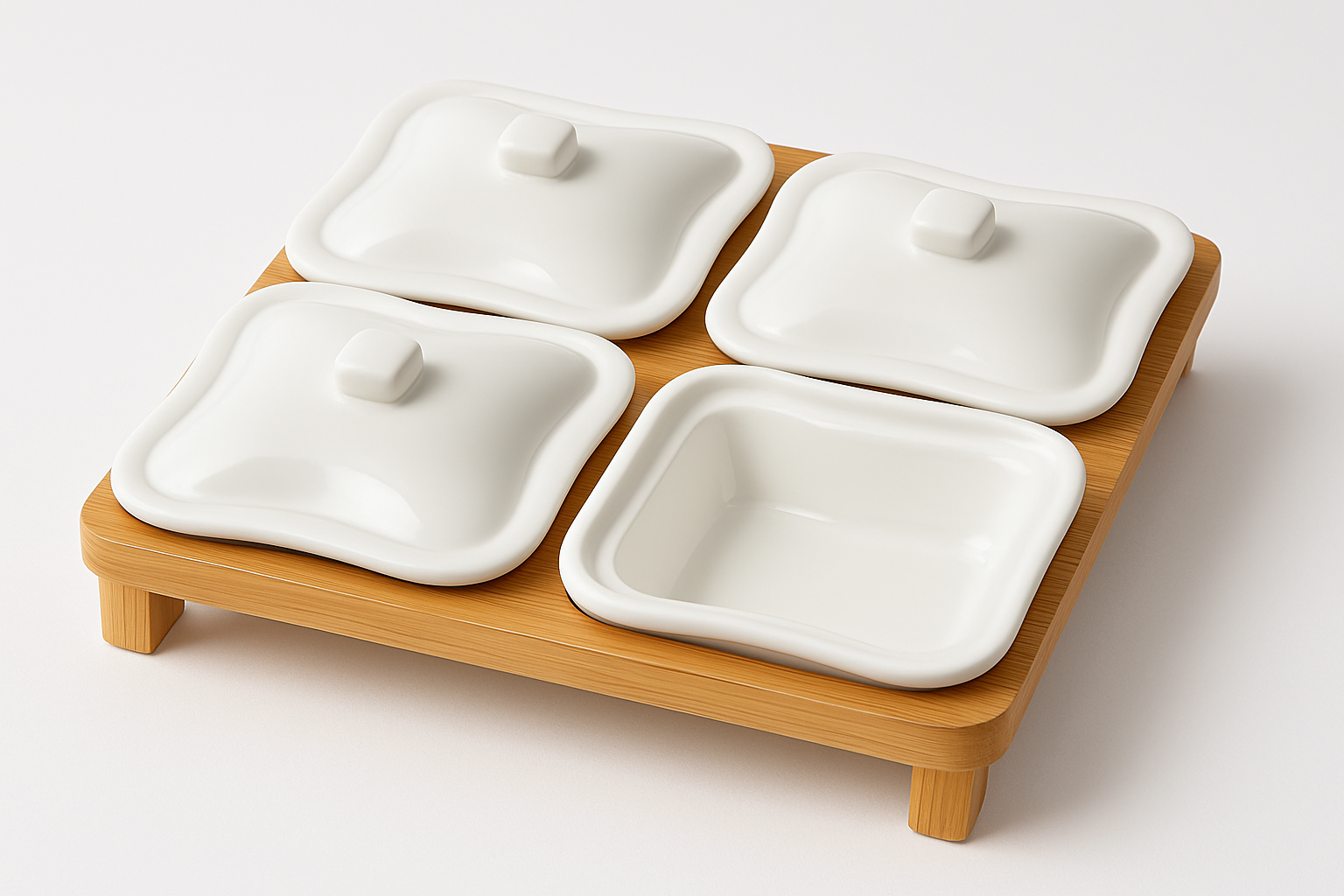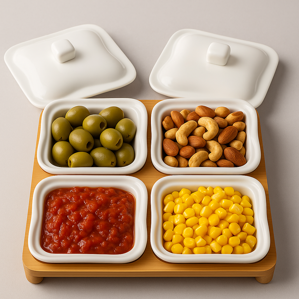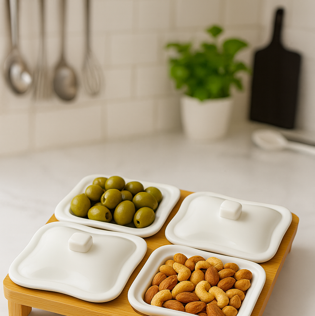 طقم أنيق مكوّن من 4 علب بورسلان بيضاء مزودة بأغطية عملية، مرتبة على قاعدة خشبية متينة لإضافة لمسة فاخرة إلى المائدة. مثالي لتقديم المكسرات، المخللات، الصلصات أو الحلويات بشكل منظم وأنيق.
