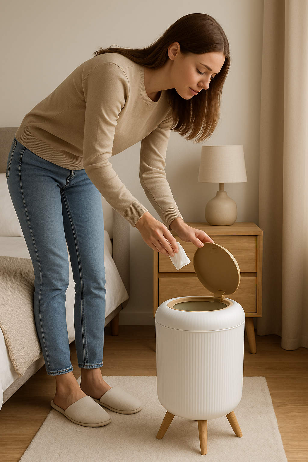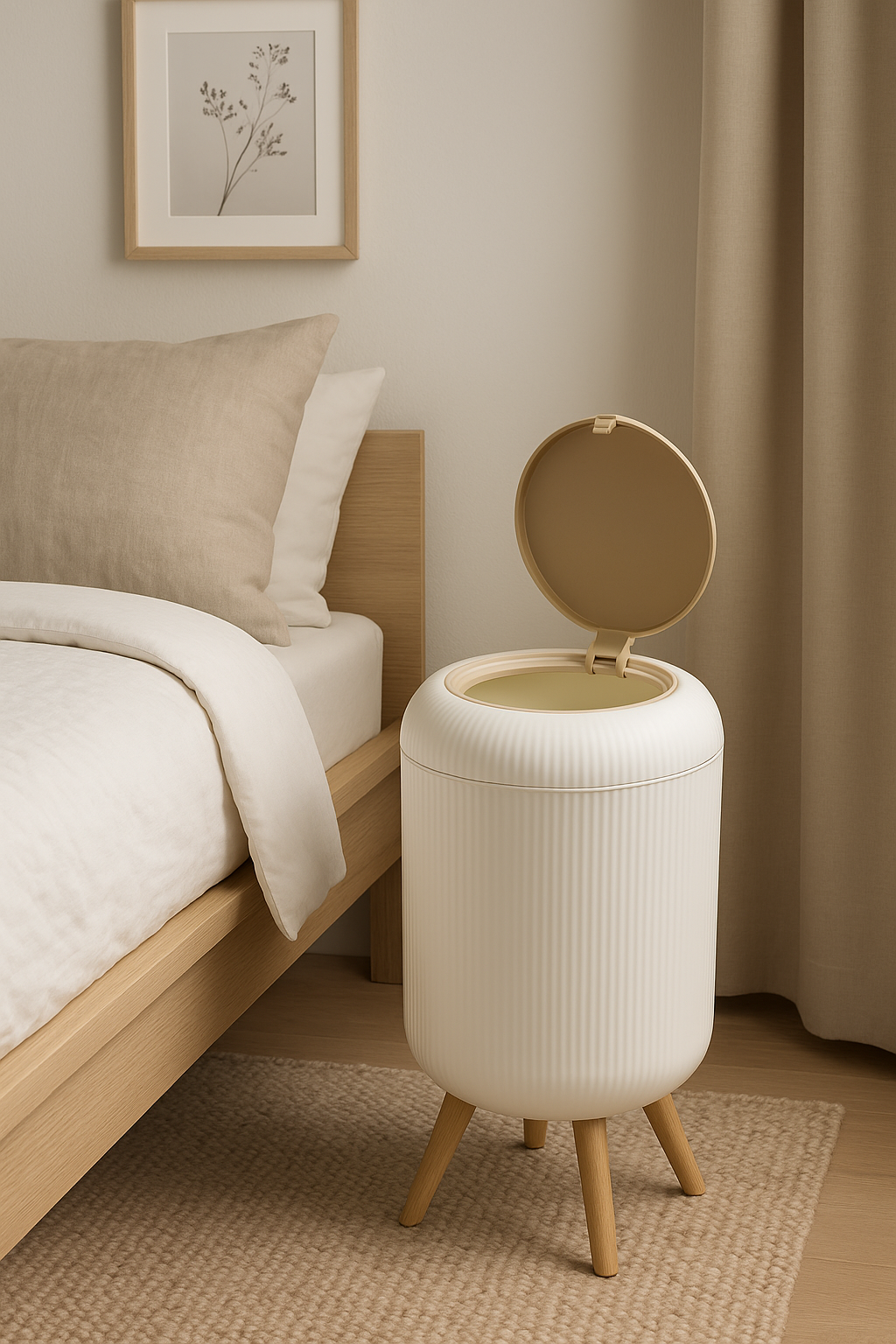 يأتي بغطاء محكم للحفاظ على النظافة ومنع خروج الروائح. مناسب للاستخدام في غرف النوم، المكاتب، الصالون أو حتى المطبخ.