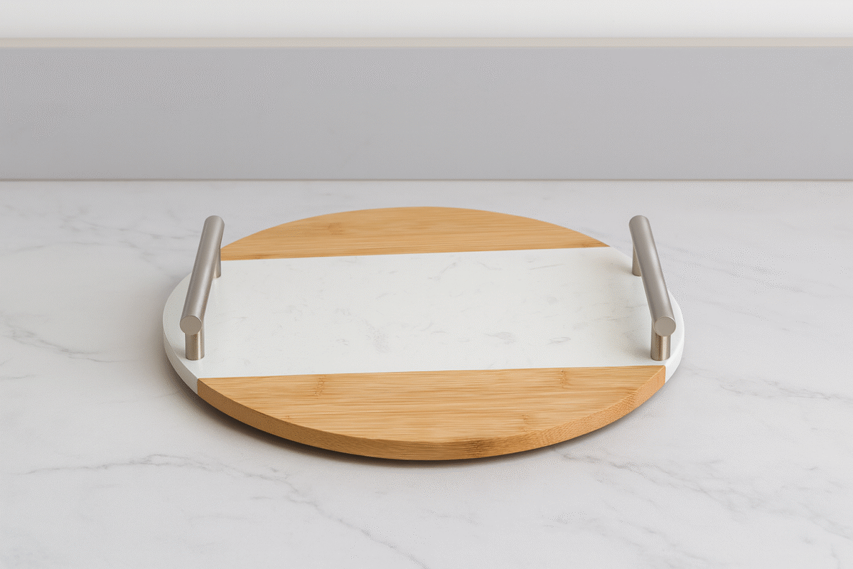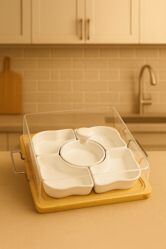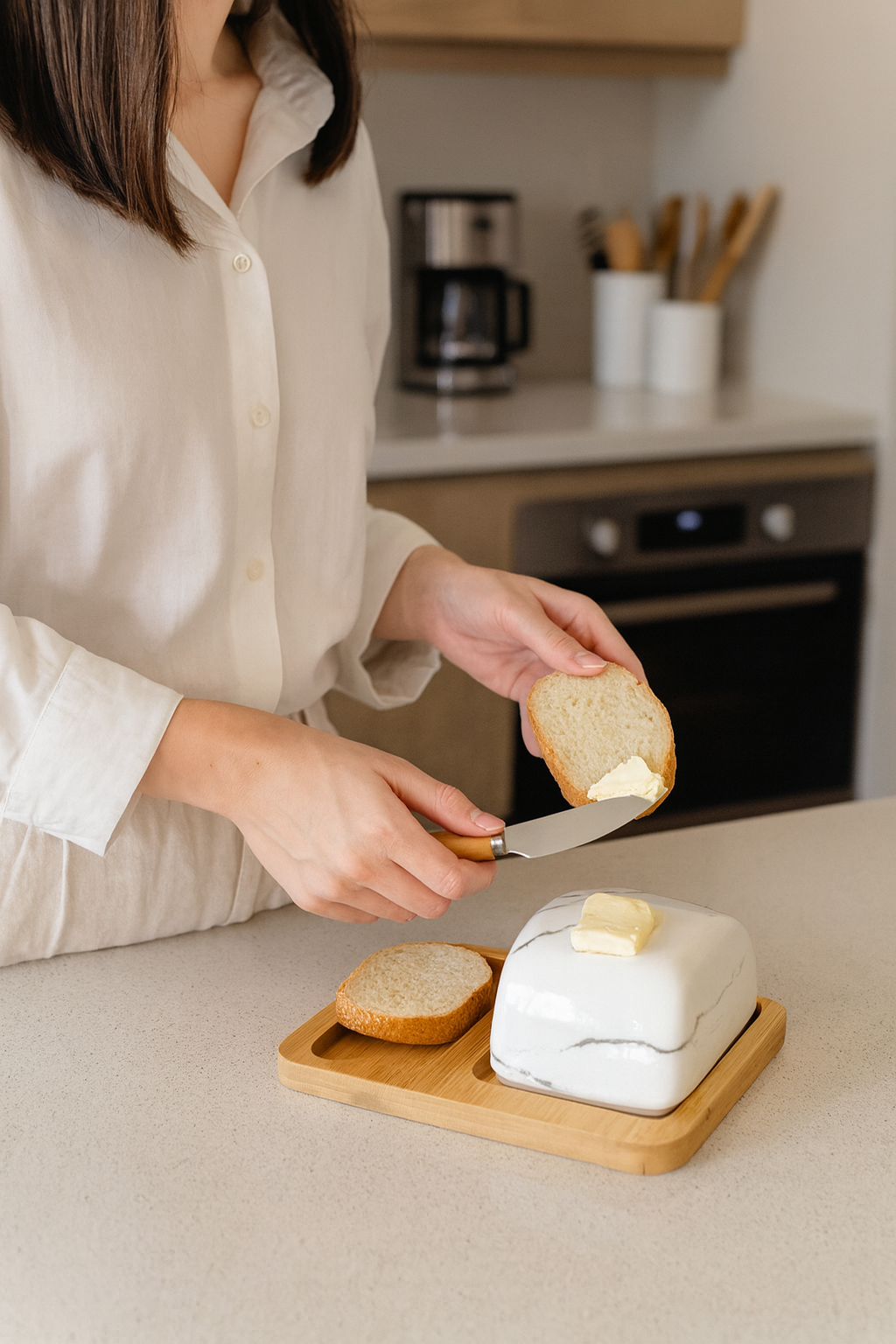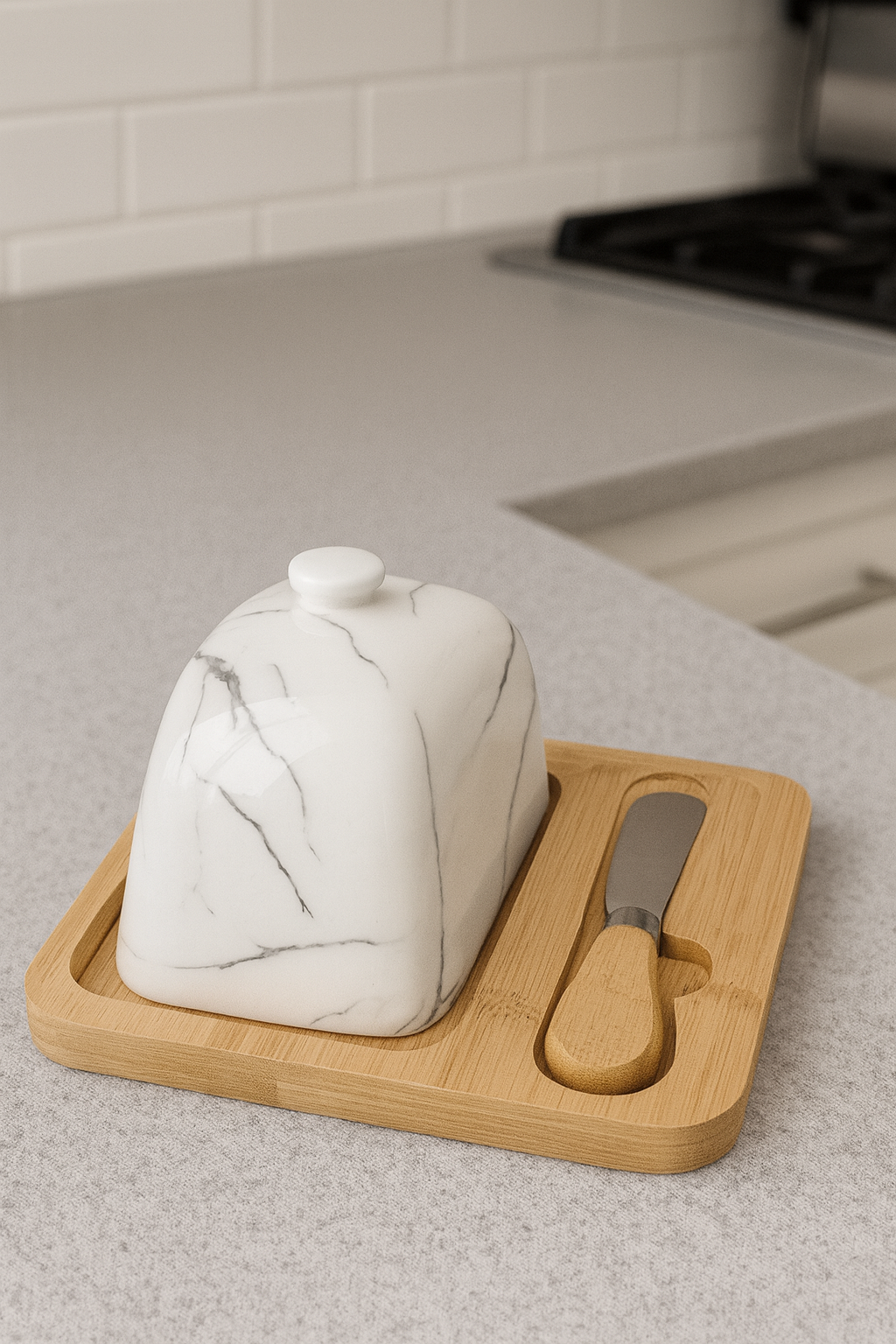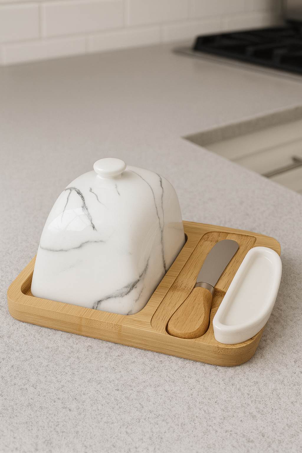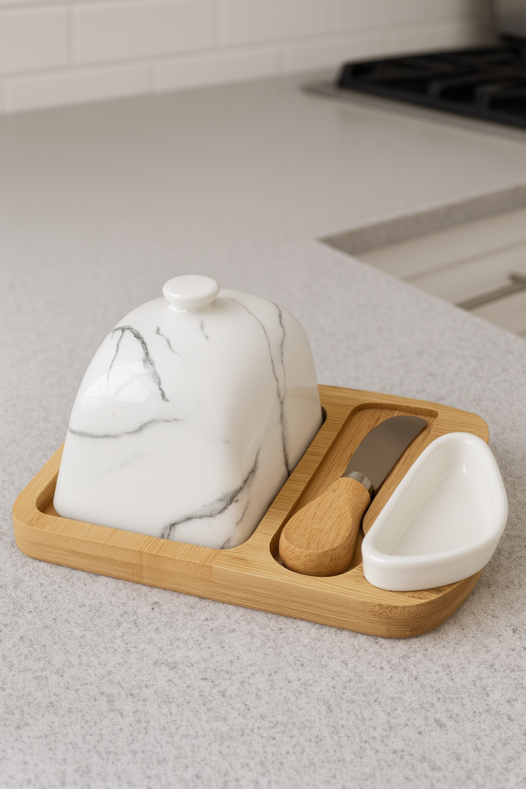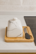 علبة زبدة أنيقة مصنوعة من غطاء سيراميك رخامي فاخر مع قاعدة من خشب البامبو الطبيعي، تأتي مع سكين زبدة من الستانلس ستيل بمقبض خشبي مريح. تصميم عملي وعصري يحافظ على الزبدة طازجة ويضفي لمسة راقية على مائدة الإفطار أو العشاء.