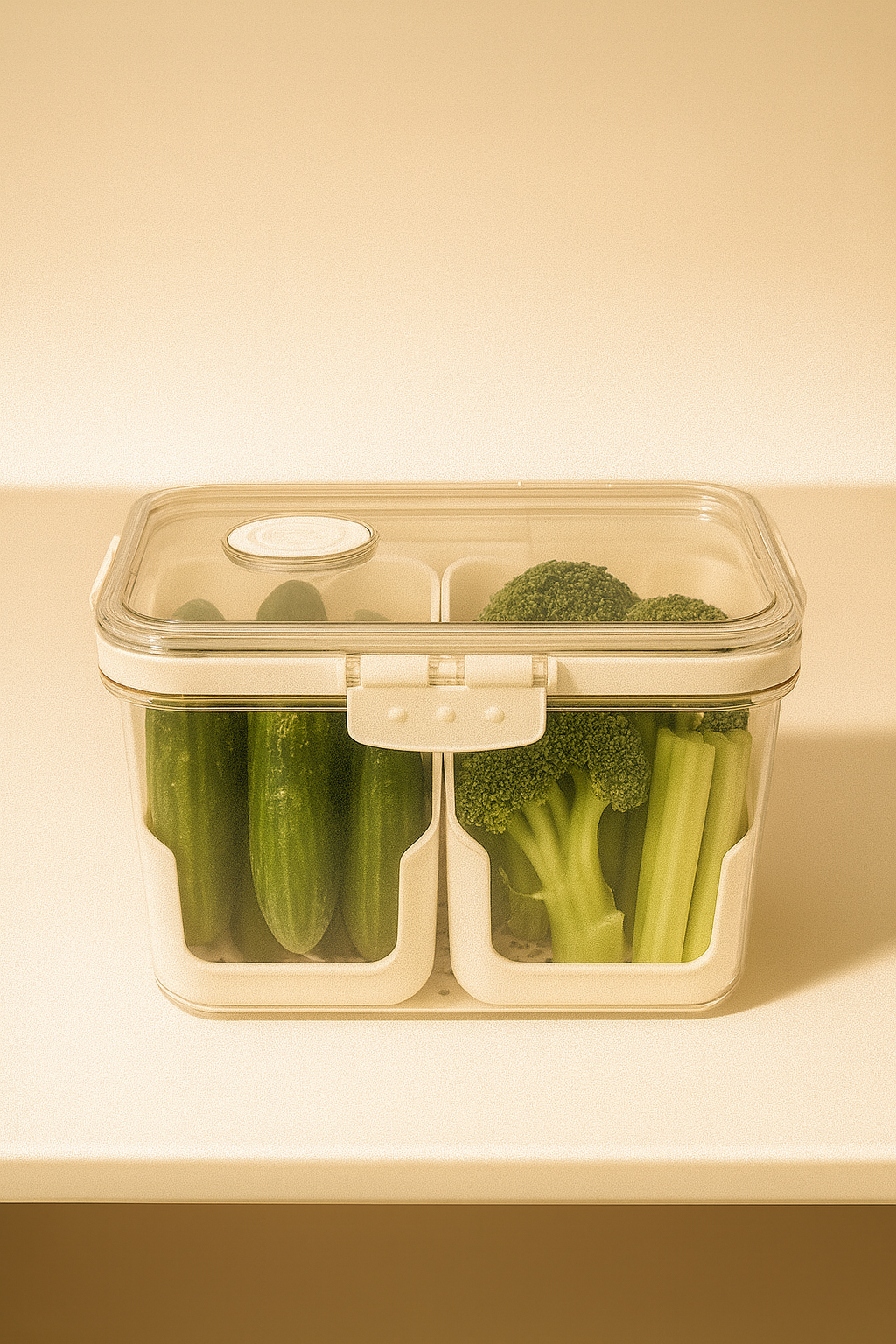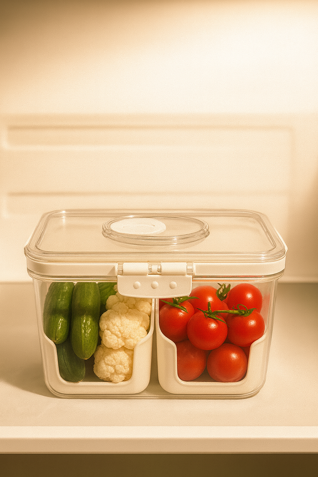 حافظة ثلاجة عملية بغطاء محكم وإمكانية فتح وغلق التهوية من خلال فلتر دائري في الغطاء، يساعد على التحكم في الرطوبة والحفاظ على الخضروات والفواكه طازجة لفترة أطول. تأتي بتصميم شفاف مع سلة داخلية قابلة للإزالة لتصفية المياه وتنظيف أسهل. مثالية لحفظ الورقيات، الفاكهة، والخضار بشكل صحي ومنظم.