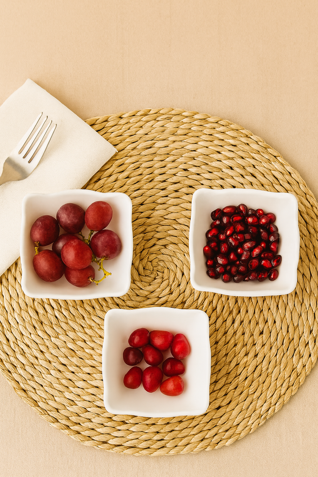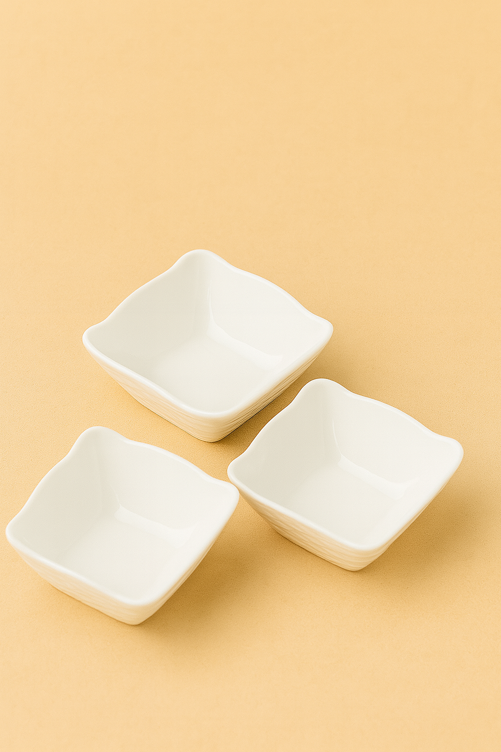 طقم أنيق مكون من 3 أطباق بورسلين باللون الأبيض بتصميم مربع بزوايا مموجة ونقشة بارزة على الجوانب. مثالية لتقديم المكسرات، المقبلات، الحلويات أو الصوصات بطريقة مرتبة وأنيقة.