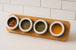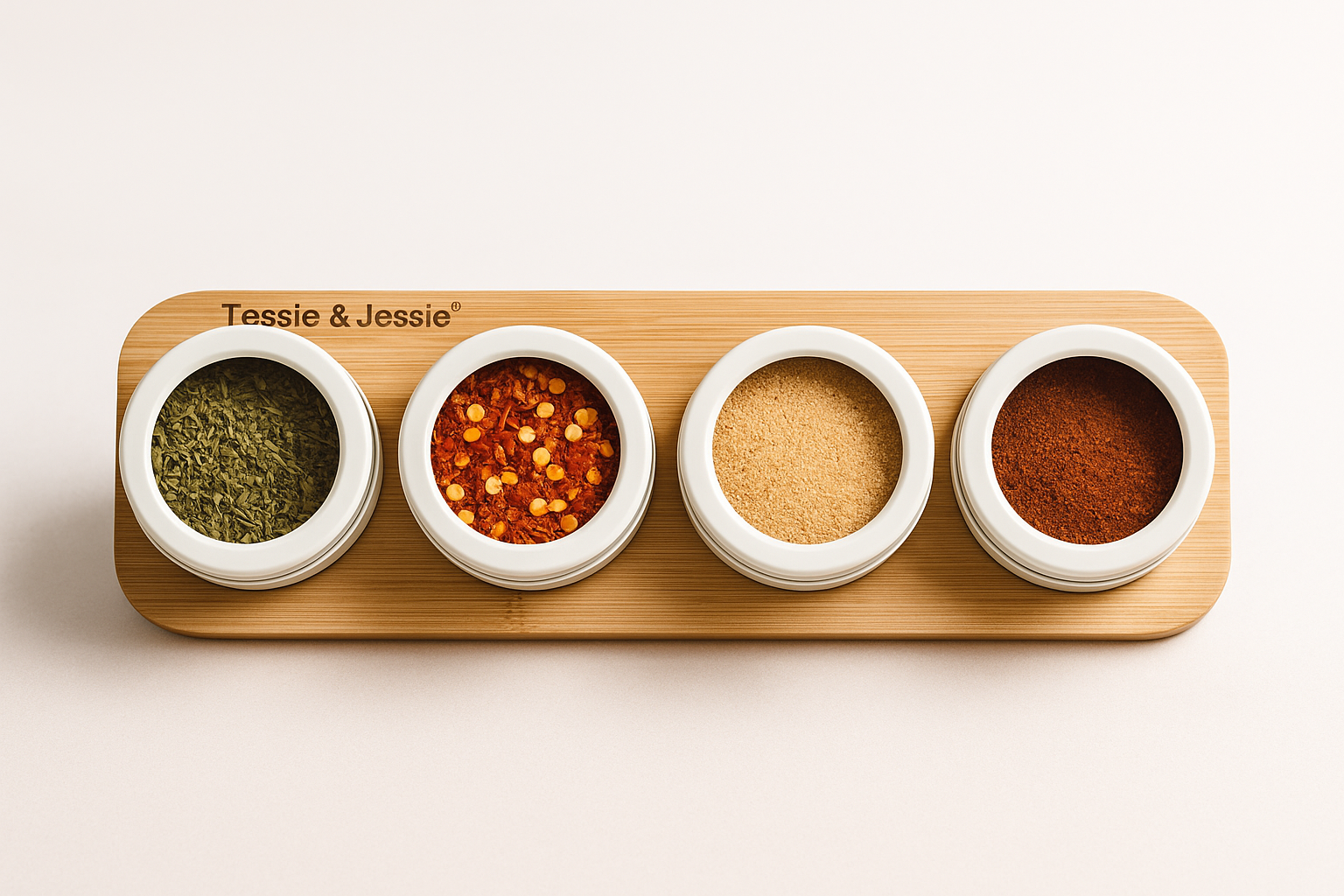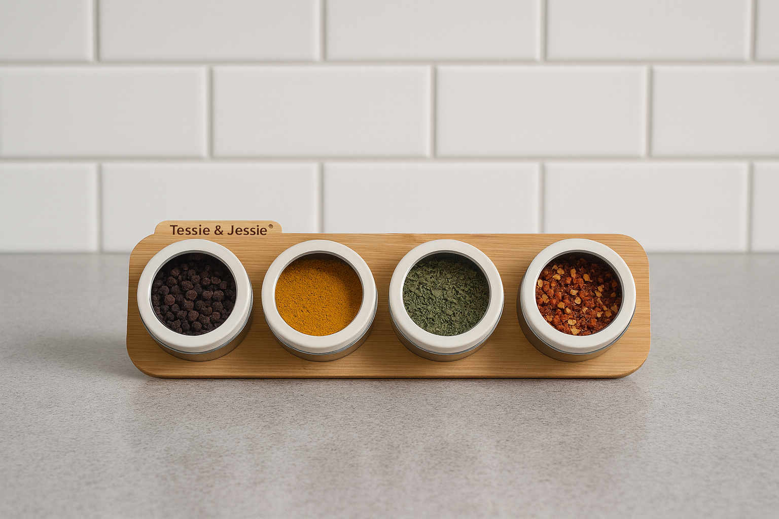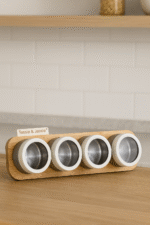 طقم بهارات أنيق مكوّن من 4 علب صغيرة مع قاعدة خشبية عملية مزودة بمغناطيس لتثبيت العلب بشكل آمن ومنظم.