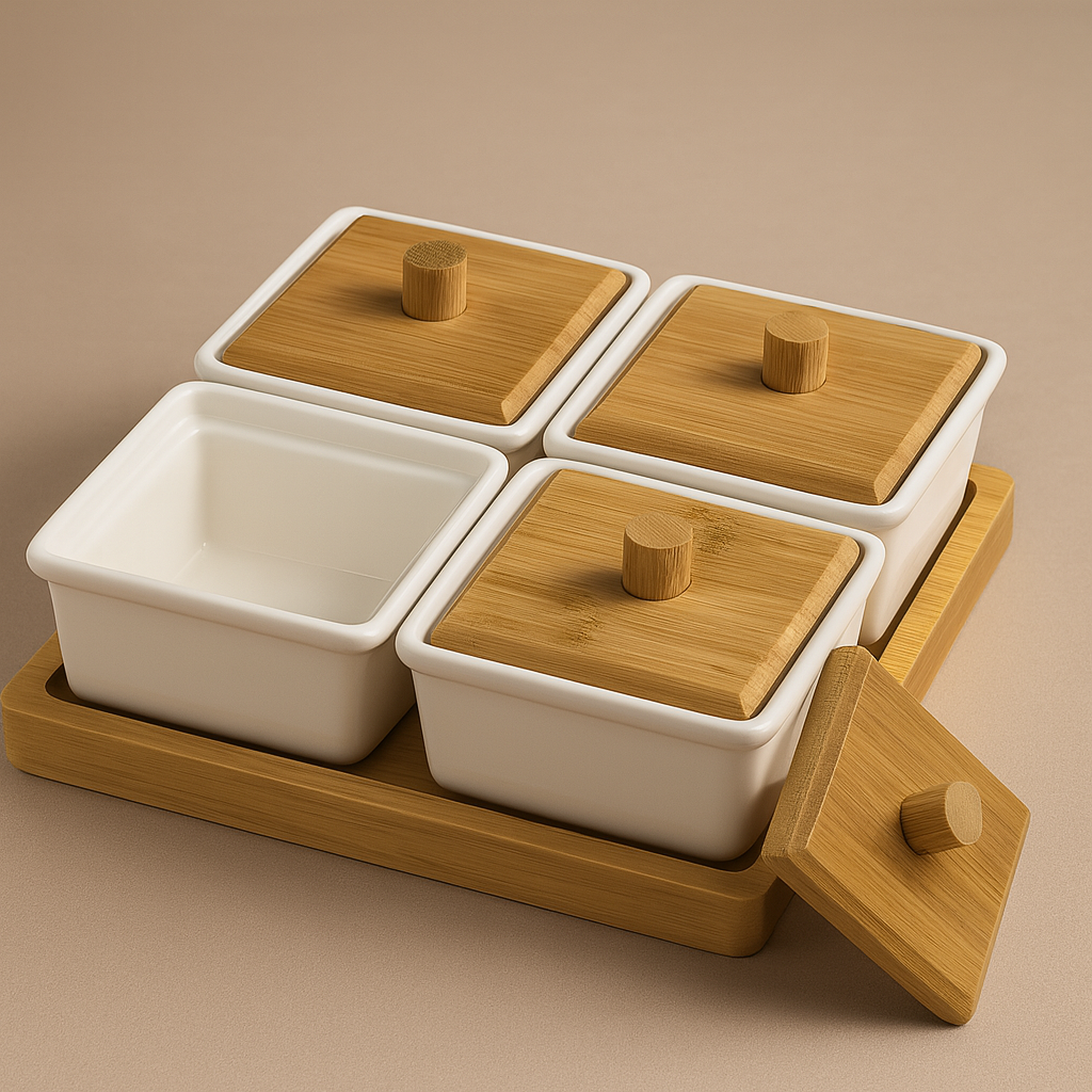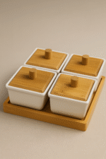 4 علب سيراميك عملية بغطاء خشبي أنيق.