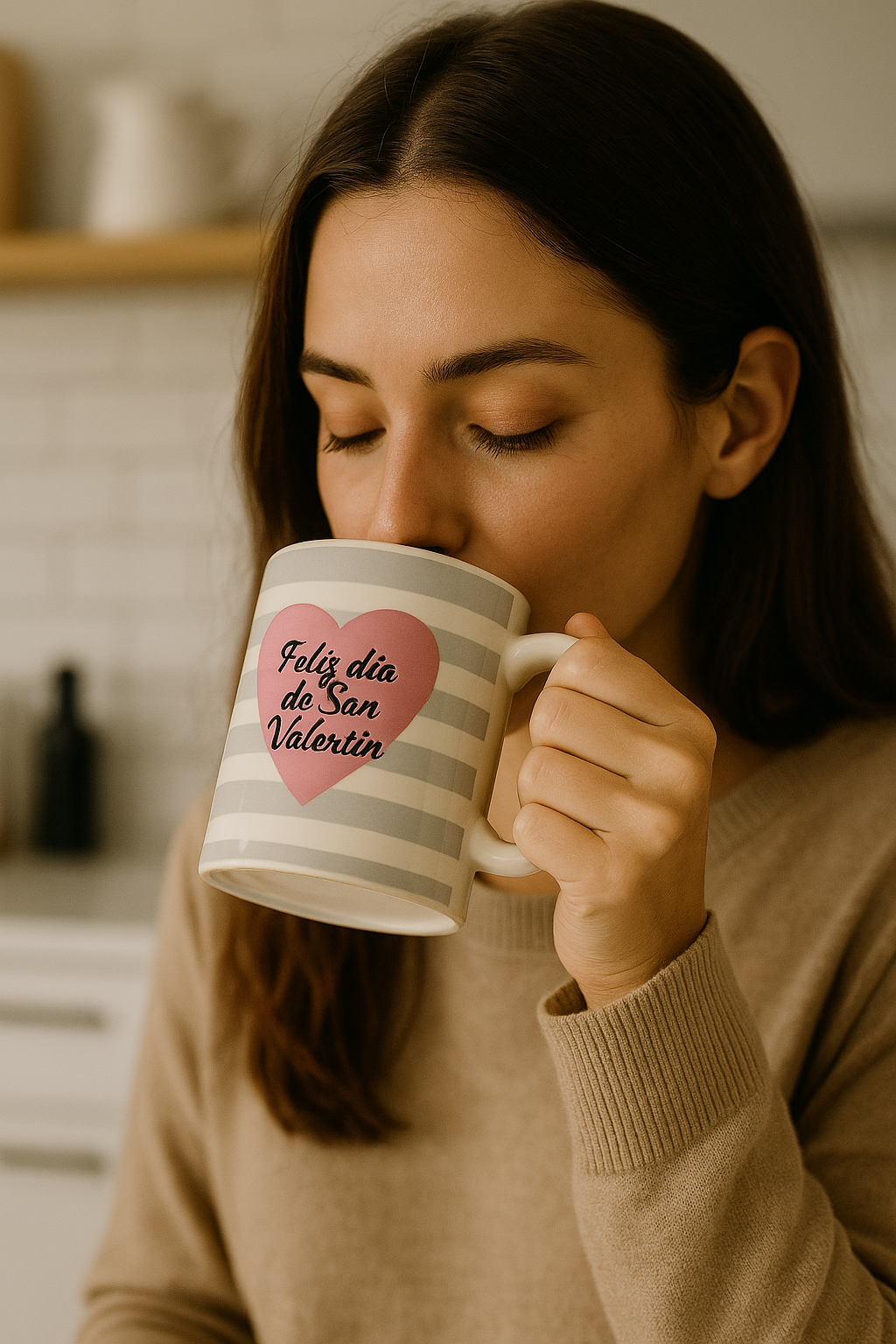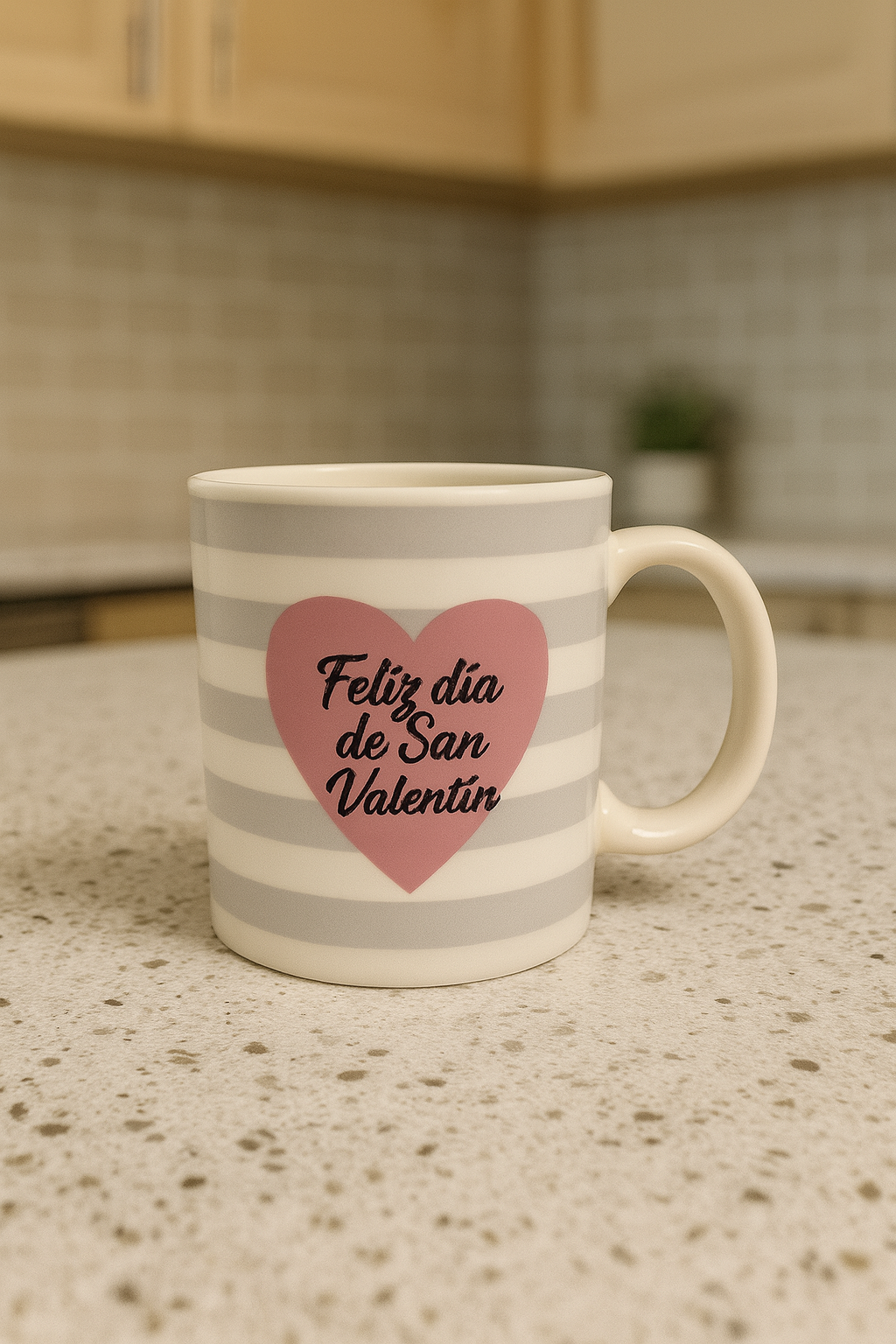 كوب سيراميك بخطوط رمادية أفقية أنيقة، يتوسطه قلب وردي كبير يحمل عبارة “Feliz día de San Valentín”. لمسة عصرية وراقية.