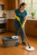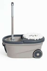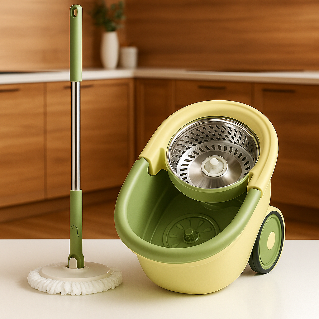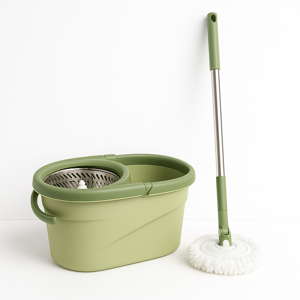 يأتي الجردل والممسحة بتصميم أنيق يجمع بين اللونين الأخضر والرمادي، مما يضفي لمسة عصرية تناسب مختلف الديكورات.